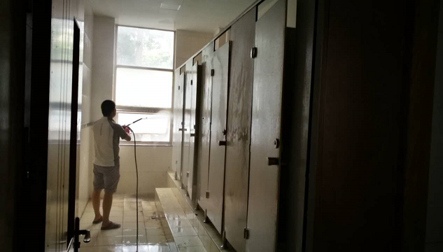 對于多年未清掃,雜物、垃圾堆積,下水管道堵塞,骯臟不堪的衛生間,年輕老師齊心協力,用高壓水槍等設備,進行了徹底的清理,改善了工作環境。