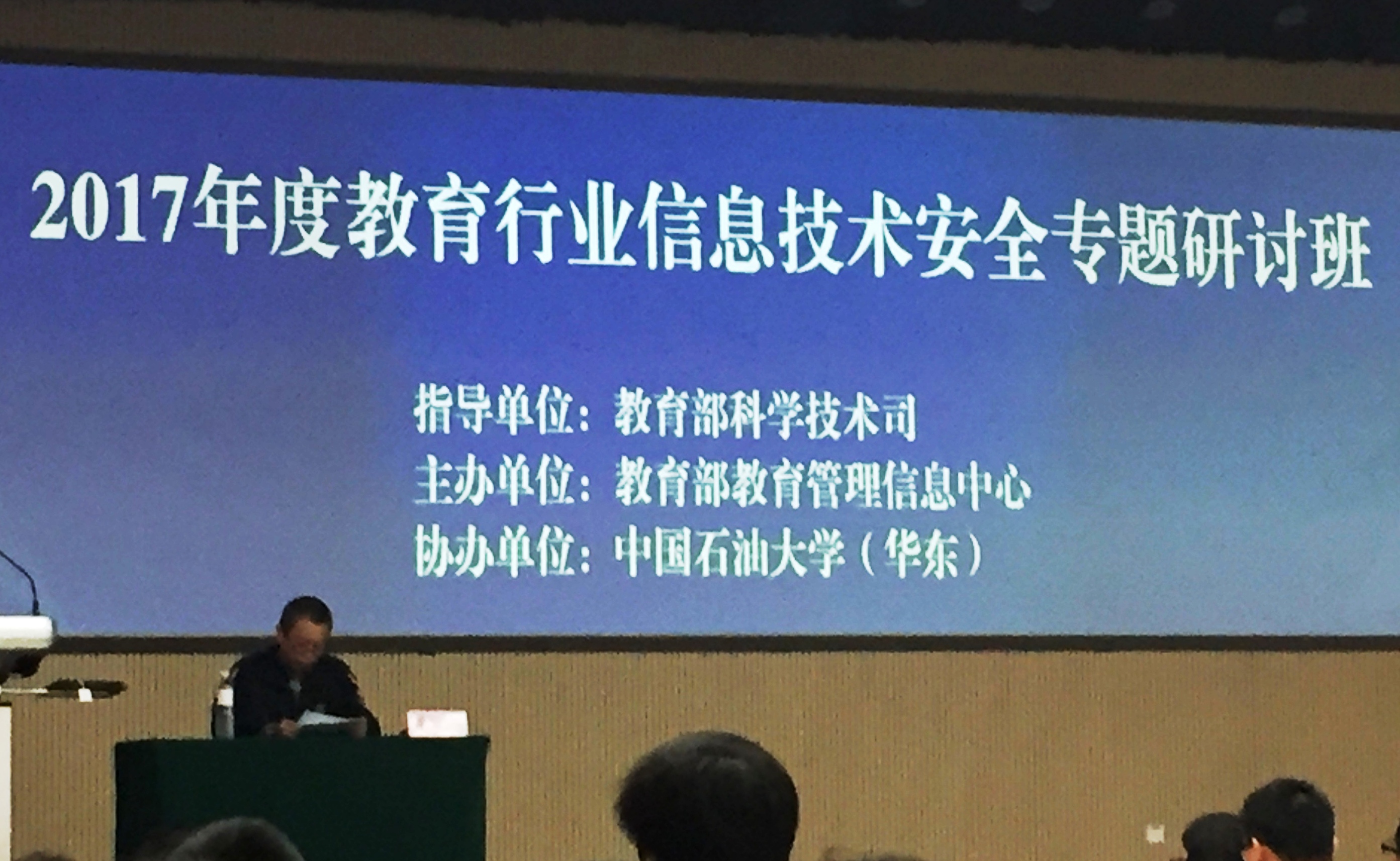 5月9日至12日,由教育部教育管理信息中心主辦,中國石油大學(華東)協辦的“2017年度教育行業信息技術安全專題培訓班”在中國石油大學青島校區舉辦,來自全國省級教育行政部門、直屬單位、部屬高校、教育網絡中心的網絡安全工作業務骨干以及信息化領域的專家學者參會,網管中心技術人員應邀參加培訓。